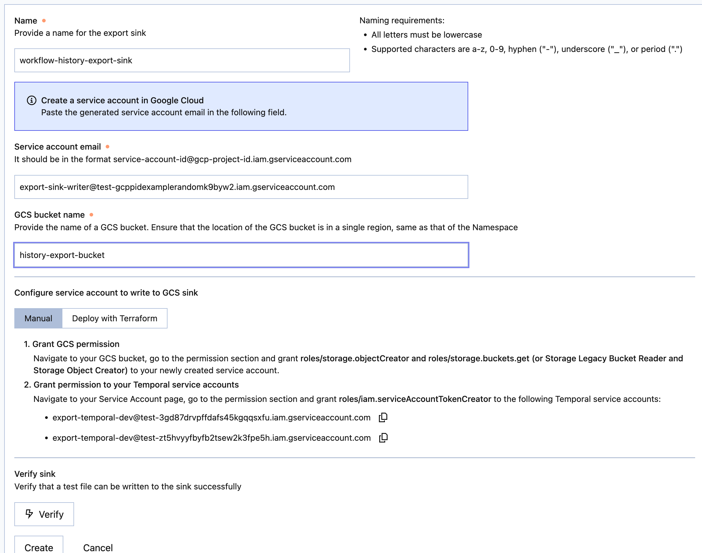 - Follow the instructions in the Temporal Cloud UI. There are two ways to set up this service account:
